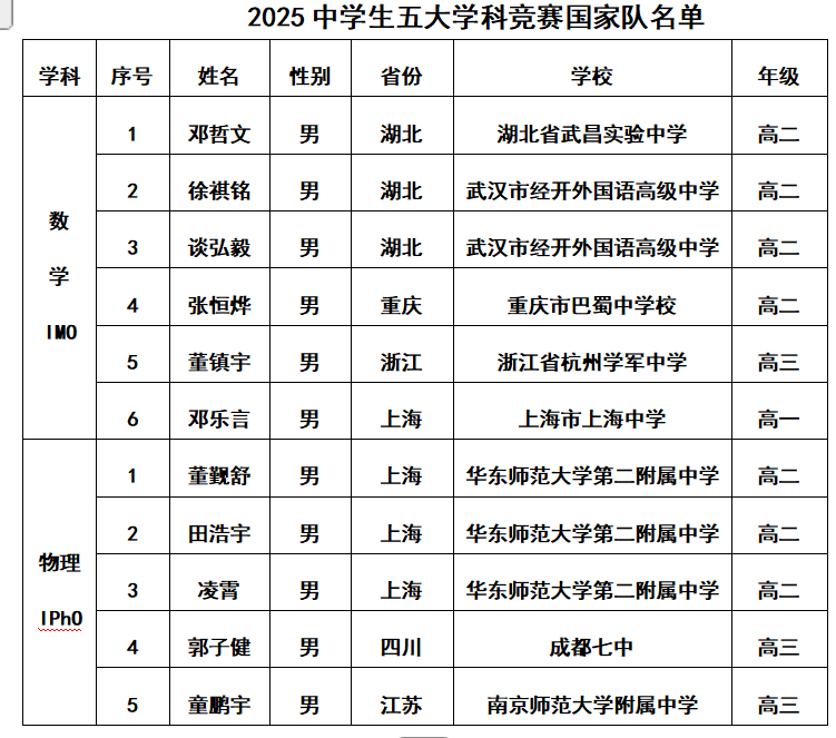 江浙沪粤鄂包揽15个席位,经济与教育的正相关定律再次应验。值得玩味的是,川渝以5个席位异军突起,湖南、山西和陕西小伙单骑闯关成功,为资源分配提供了新注脚。2024年表现出色的北京,在2025年竟无一人进入国家队,这一巨大的反差令人惊讶,从而导致这次北方省份团队团灭,无缘此次2025五大学科国家队。
